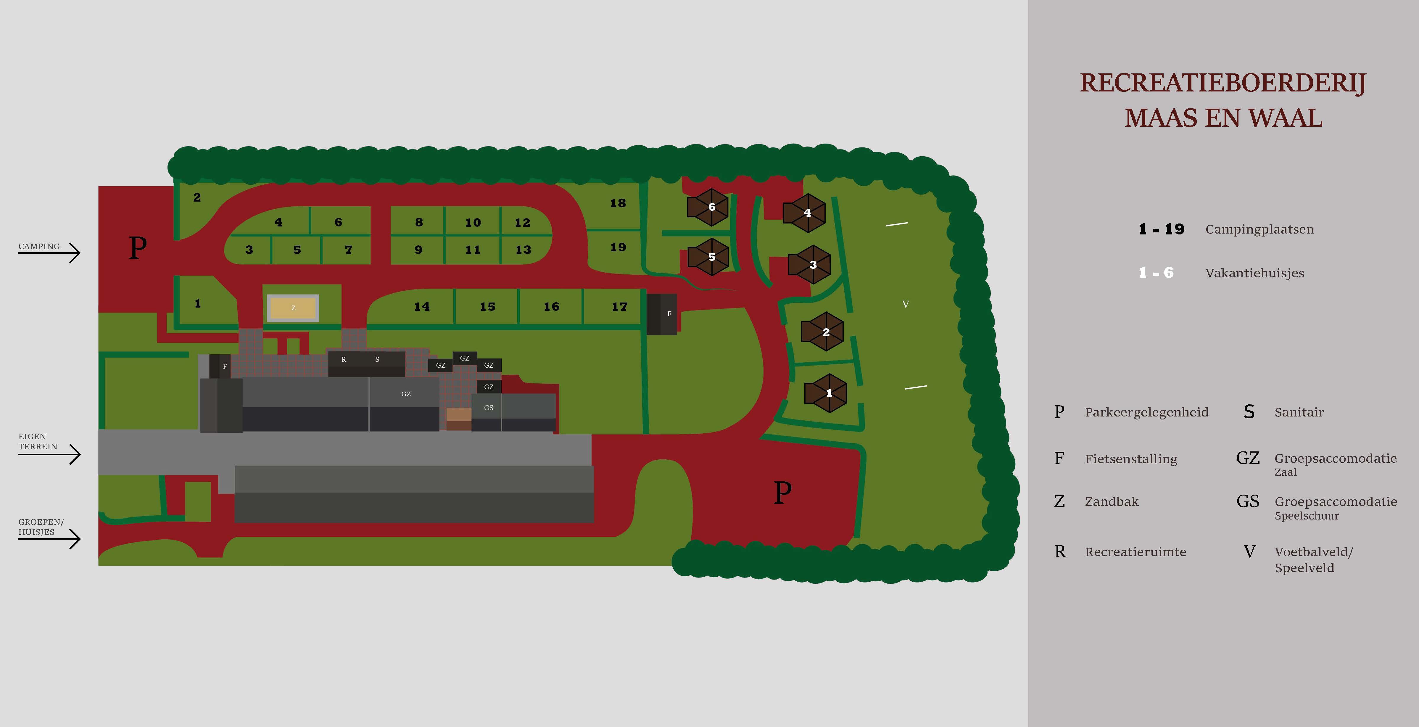 Hieronder vindt u een plattegrond van de camping en de groepsaccommodatie.